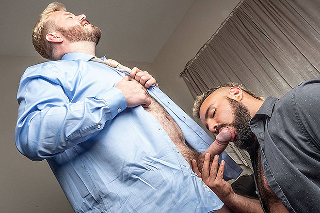 Beefy bearded blond, John Thomas, together with his poker buddy, Luis Vega, are cleaning up after a game. But John isn't ready to end the night. He dares swarthy Luis to one more round, loser bottoms. With such an offer, who can say no? Cards are dealt and each bluffs the other, raising the stakes with a blowjob, rim job, and cock in hole. But either John knows what he's doing or Luis loses on purpose though neither is a loser as far as we're concerned because the next thing you know, they're stripping while making out. John dives straight for Luis's meaty ass, rimming the hungry hole, all the while milking Luis's cock. Soon, John offers up a huge, fat, and uncut tool (surprising since so many Caucasian American are cut) for Luis to slobber over. The Latino pig shows off some mad oral skill, deep throating John to the base and munching on his balls.